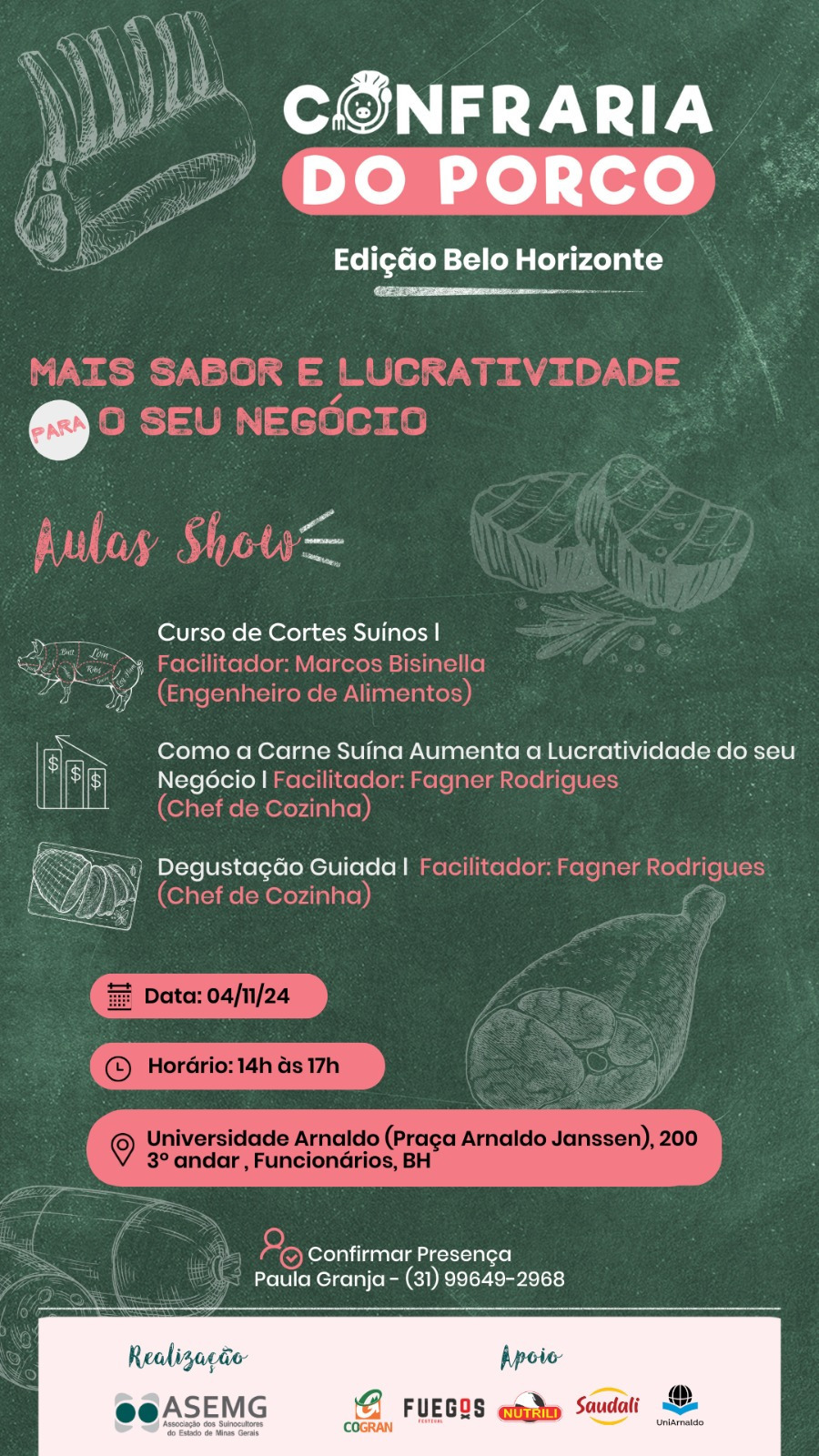 O projeto tem por objetivo capacitar o setor de bares e restaurantes a respeito da versatilidade, sabor e vantagem financeira em se ofertar pratos à base de carne suína e com isso trabalhar o aumento do consumo da proteína. As inscrições são gratuitas e será realizado na Uni Arnaldo. Se você é Chef de Cozinha ou dono de restaurante garanta já a sua inscrição! O evento contará com um curso gratuito sobre cortes suínos e uma aula show!