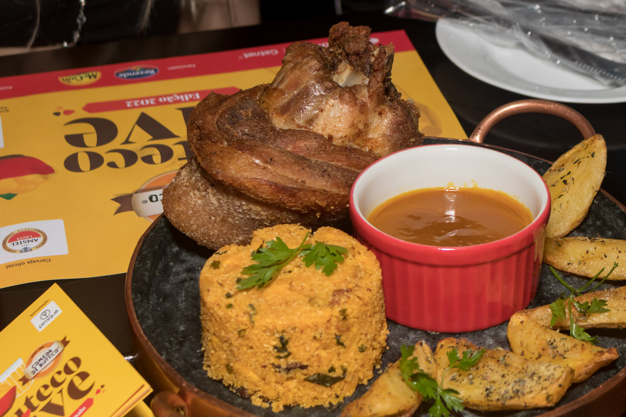 AlivôXambar Costelinha de porco flambada na cachaça, acompanhada de aligot de batata inglesa, crispy de couve e azeite aromatizado com ervas e limão siciliano.