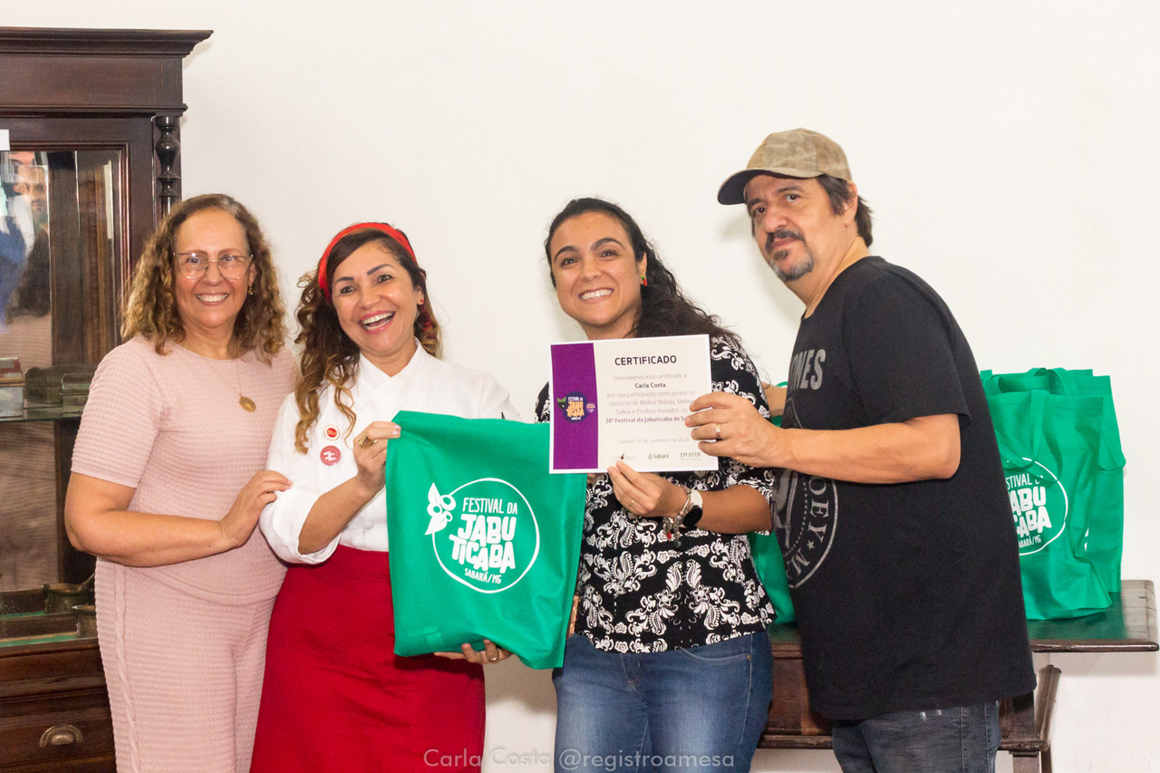 Aproveito para parabenizar a Emater Sabará, representada pela Silvia Maia e Shellen Mainente e a Asprodejas — Associação dos Produtores de Derivados de Jabuticaba de Sabará muito bem representada pela sua presidente Elizabeth Torres, que muito se empenhou para realização desse concurso tão significativo e saboroso.